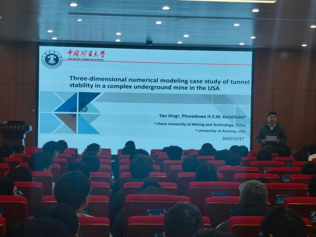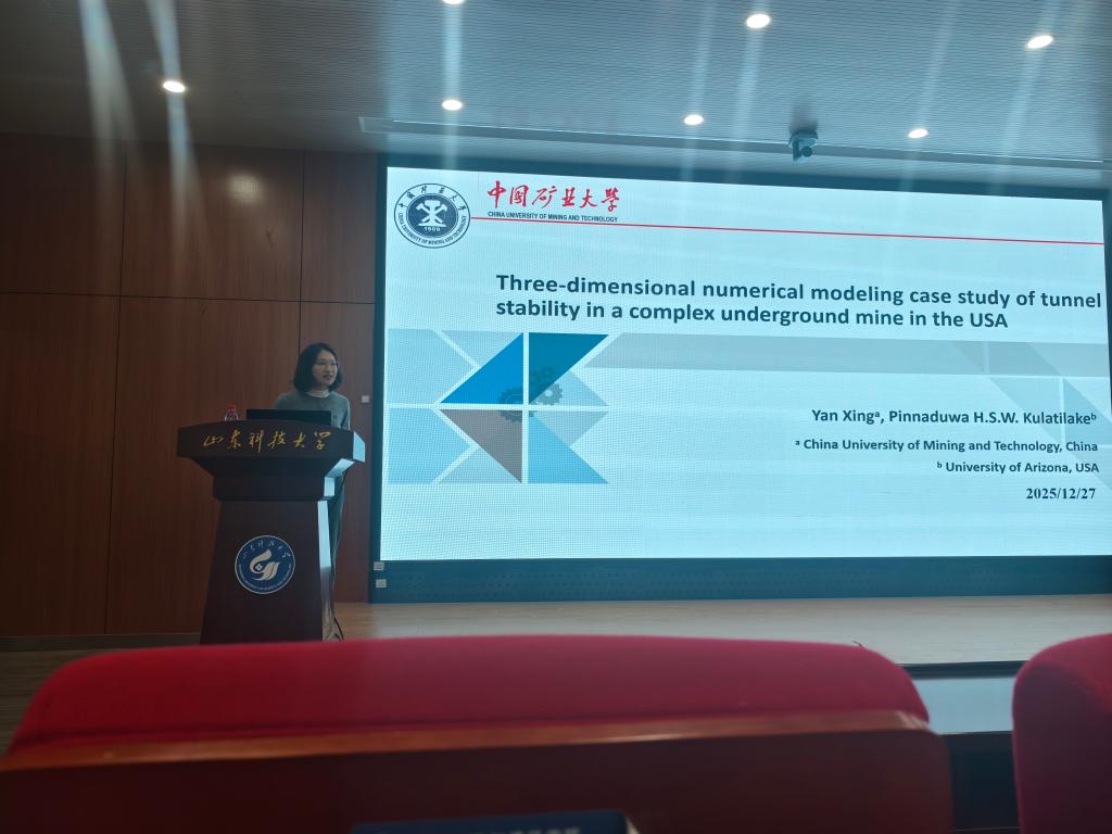 YanXing博士作了题为《美国一座复杂地下矿井中隧道稳定性的三维数值模拟案例研究》的报告。她系统阐述了从矿场概况、隧道几何结构到数值模型构建与应力分析的完整研究路径,分享了复杂地质条件下隧道稳定性评估的先进模拟方法与宝贵工程经验,为师生呈现了严谨的工程研究范式。