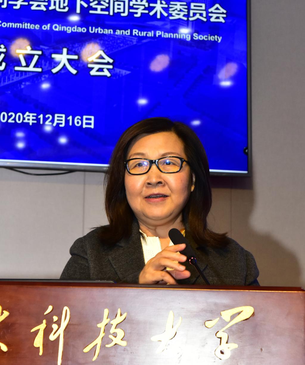 潘丽珍代表青岛市城乡规划学会发表致辞,介绍学会情况和地下空间学术委员会成立背景,希望地下空间学术委员会成立后,能够发挥公司优势,在促进青岛城市地上、地下有机协同发展的同时,扩大在全国地下空间领域的影响力。