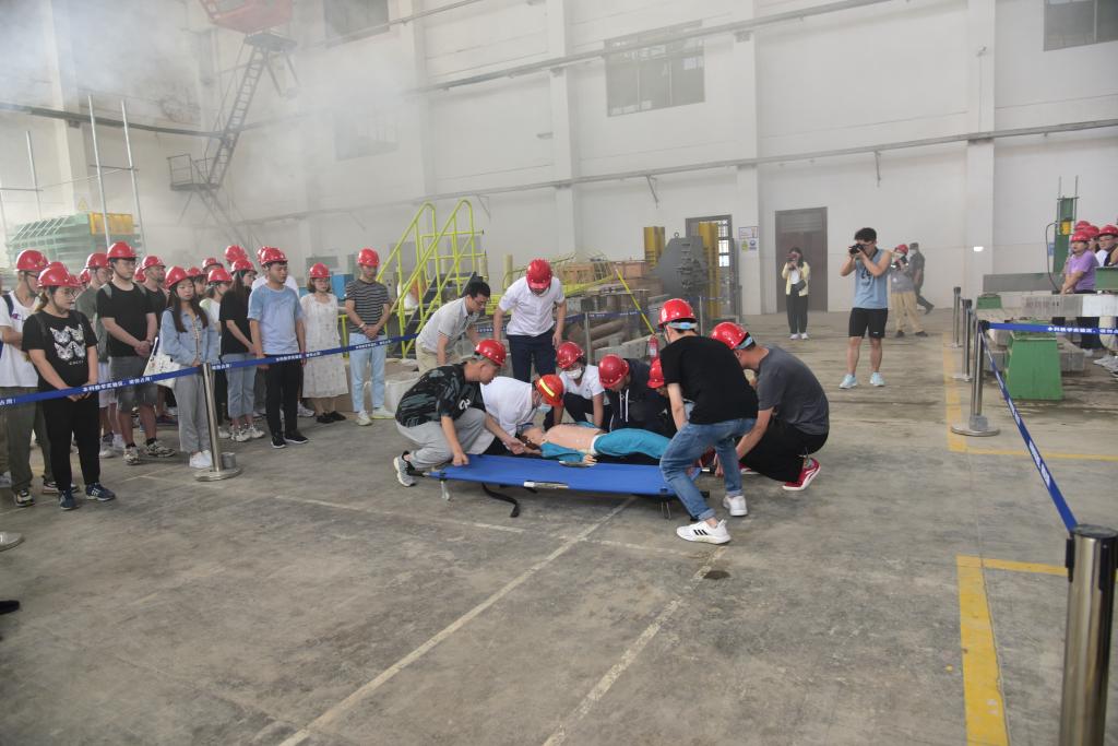 张英杰副董事长宣布演练开始。安全应急演练模拟了结构大厅实验室在使用过程中发生高处坠物的场景,坠物砸断设备接线后砸伤一名同学,断开电线与伤员身体接触导致昏迷,同时断裂的线路短路起火。演练分为事故发生、事故确认与报告、启动应急响应与先期救援、伤员转移与急救、人员撤离等部分,各环节衔接紧密、协调有度,演练人员反应迅速、行动果断,为现场观摩人员上了生动一课。