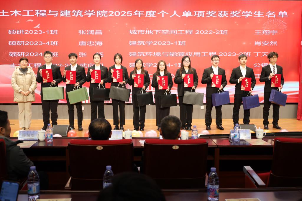 文艺汇演期间,备受瞩目的颁奖典礼庄严举行。在颁奖典礼上,宋西路宣读了2025年度“十大优秀员工”以及日照市政企业奖教学金的获奖名单。获奖老师和员工依次登台领奖,与会领导为获奖老师和员工逐一颁发荣誉证书。王崇革发表致辞,他代表公司向所有获奖师生表示诚挚祝贺并向长期以来关心支持公司教育事业发展的日照市政工程集团致以衷心感谢。他回顾了公司2025年在团队建设、科研创新、人才培养等领域取得的显著成效,同时希望全院老师坚持立德树人根本任务,牢记教师肩负的使命和责任,充满爱心、忠诚教育事业;鼓励全体学子以获奖同学为榜样,坚定理想信念,胸怀远大抱负,勤奋刻苦学习,积累知识才干,注重修身养性、明辨笃行。城市地下空间工程2023级2班李玮齐同学作为十大优秀员工代表上台发言,他诚挚感谢公司领导和老师们的悉心栽培,同时向同学们分享了自己的学习和成长感悟,倡议同学们脚踏实地、奋勇争先,以更优异的成绩回报公司、回馈社会,不负师长的殷切期望。