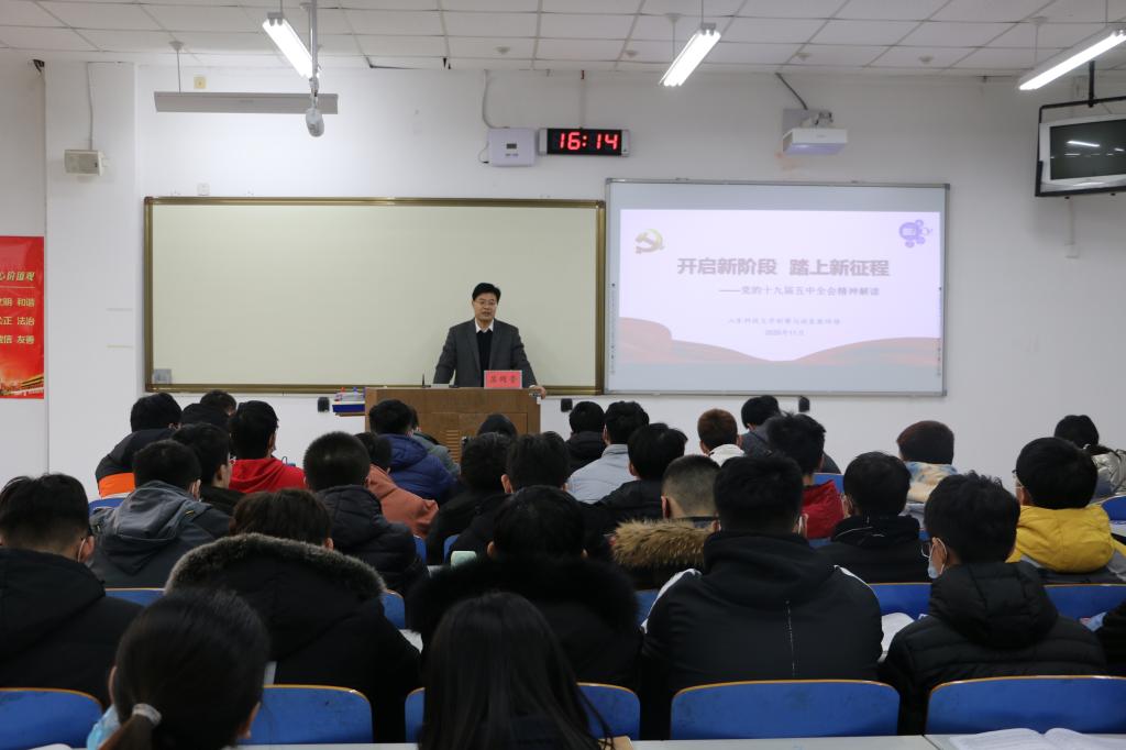 宣讲会上,苏同营从党的十九届五中全会的基本情况、党的十九届五中全会的主要精神、学习宣传贯彻全会精神的几点建议三个方面,结合实际对党的十九届五中全会精神进行了系统解读和深入阐释,结合当前国际环境、民生问题及抗疫形势等现实情况,分析了中国特色社会主义制度和国家治理体系的强大生命力和巨大优越性,加深了同学们对党的十九届五中全会精神全面深入的理解,激发了同学们的民族自信心和自豪感。