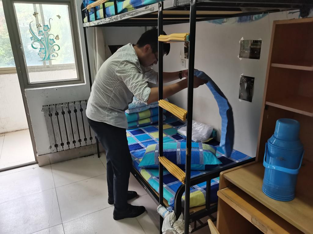 今年新生报到受疫情的影响,很遗憾家长们无法进入校园,考虑到同学们都是00后,大部分同学可能在家都没有亲自装过床单、被罩,为了给同学们营造温馨、暖心的宿舍氛围,我们组织员工党员给新生提前把床铺铺好,让同学们一进宿舍就能感受到家的温暖同时也是让家长们放心。