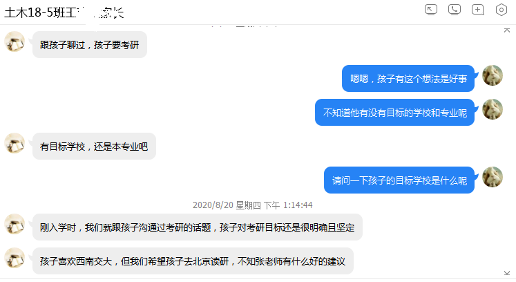 8月份,公司员工工作办公室各辅导员通过线上家长会、家长群、电话家访、微信一对一沟通等方式,根据员工具体情况和所处年级和时期,沟通了解员工在家期间的学习生活情况和生活动态,反馈员工在校期间表现,询问家长对员工的培养理念和期望,并给予建议。辅导员鲍娜娜在城乡规划和建筑学专业线上家长会上,向家长们介绍了2015级毕业班的就业与考研情况,并针对考研录取率背后折射出的原因和问题提醒家长们要根据员工实际学习状况规划合理目标、做出最佳选择。