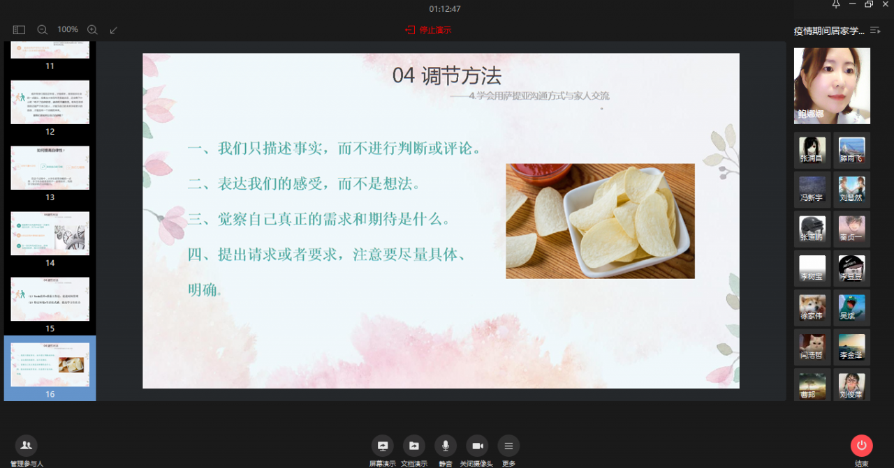 鲍娜娜结合国家疫防控形势,针对停课不停学、居家学习的实际,通过对员工目前居家学习状态及相关心理成因进行系统分析,从学习态度改变、学习动机激发、行为塑造等方面,就居家学习情绪调节、学习计划制定、学习时间安排、学习效率提高以及与家人的沟通等问题,和同学们进行了深入的在线交流、互动和解答,帮助员工调整心态,注重习惯养成,掌握沟通方式,合理规划居家居家时光,充实快乐地度过居家学习生活。