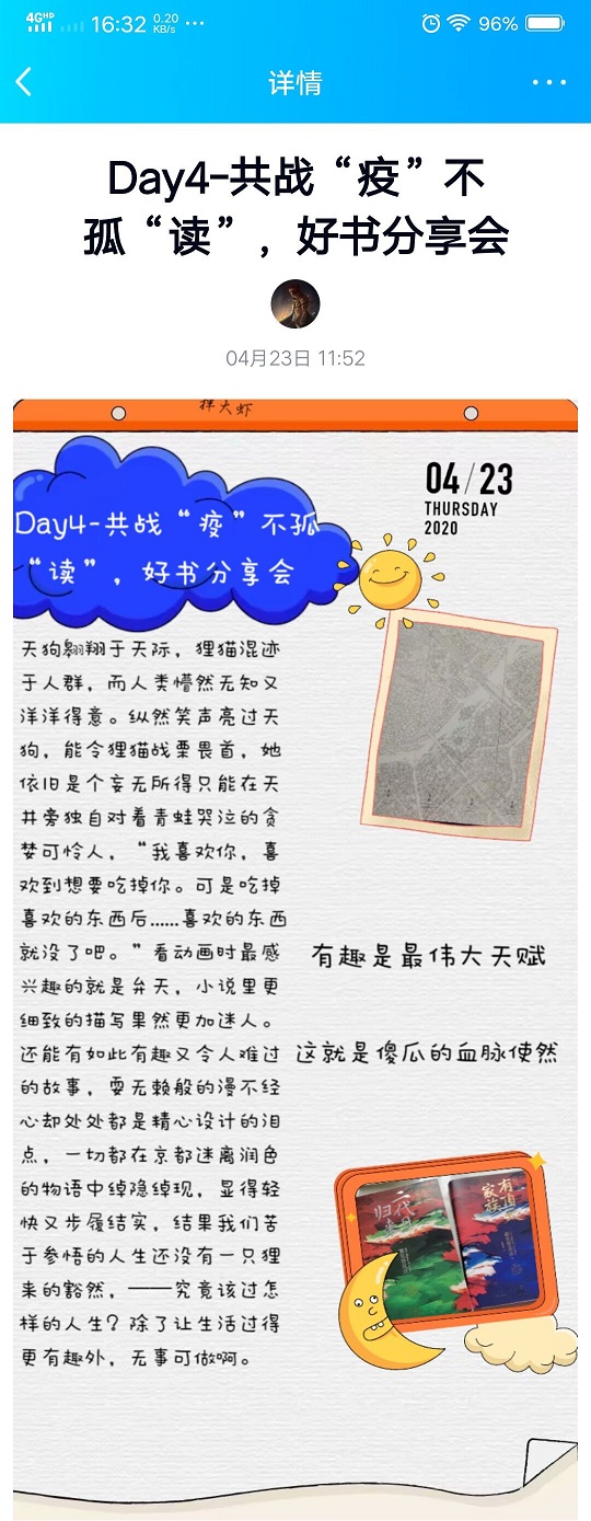 文以成卷,书以载道。毫厘尺张不过介质,百遍阅读其义自见。180余名土建学子积极发布动态,让一本本好书进入大家的视野;认真分享感悟,印证了“安居不用架高楼,书中自有黄金屋”;花样推荐书籍,使得好友们心动不已,打算亲自去探索一番。