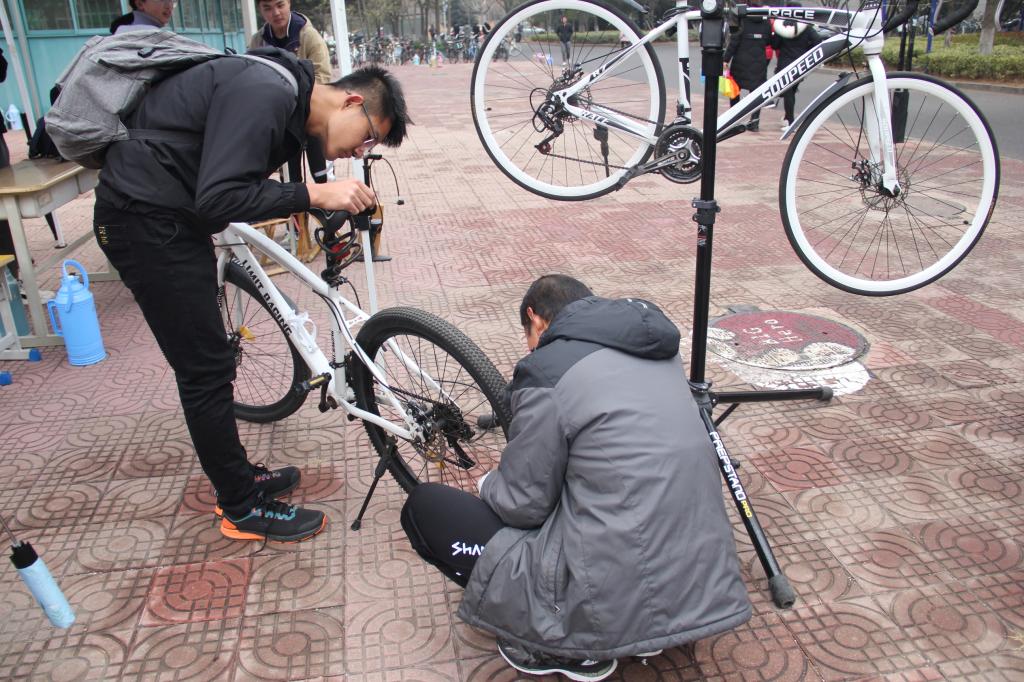 清晨,志愿者们早早地准备好修理工具,搭建修理工作棚,为今日的志愿活动做好准备工作。未几,便有同学陆陆续续地带着自行车前来修理。维修师傅和志愿者们仔细地检查自行车的每一部分,尤其是对链条、车轴以及变速器等容易造成安全隐患的部分格外细心排查。发现问题后,出手迅速,熟练解决。对于锈迹斑斑、保养欠缺的自行车,维修师傅则提出简单的保养方法,方便同学们日后自行维护。自行车修好之后,同学们的喜悦之情溢于言表,纷纷向维修师傅和志愿者们道谢。