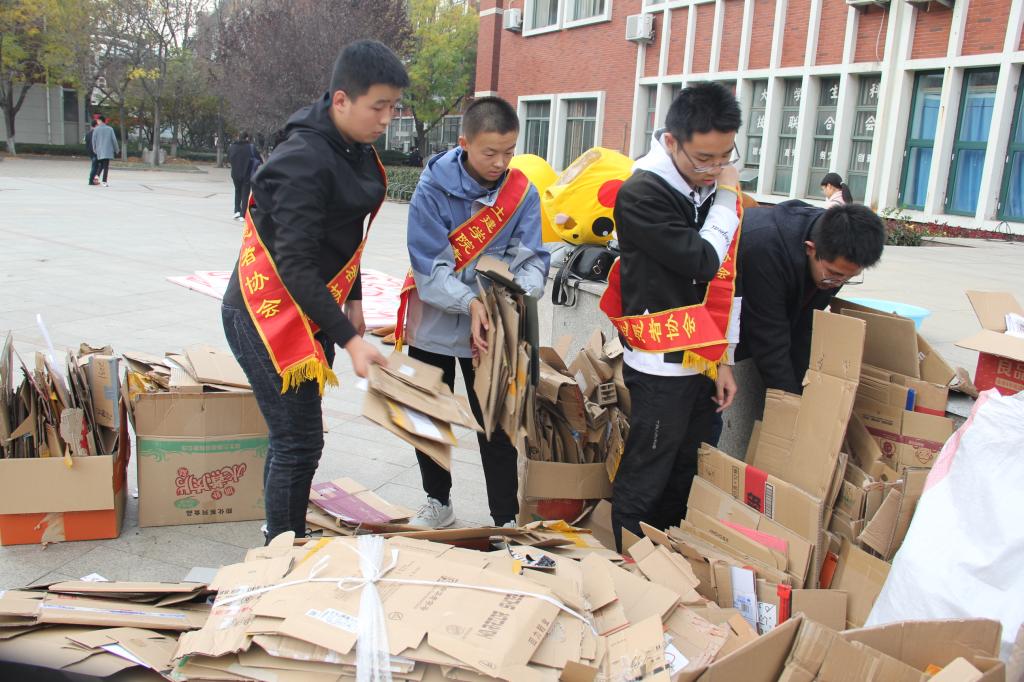 适逢双十一购物节,同学们积攒了较多的快递盒,公司的志愿者们便每晚马不停蹄地拜访各个宿舍,询问并收集瓶子、纸板等废品,并将它们分类打包。同学们更是积极配合,纷纷贡献出那份属于自己的爱心。在完成收集工作后,11月16日中午,志愿者们废品整理好,运往繁星广场进行总分类入袋。看着自己的收获成果,志愿者们露出满足的笑容。