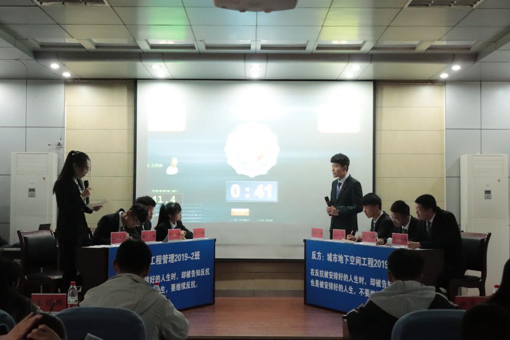 辩论是一门独特的艺术,它所引发出来的智慧与思考,无时无刻不让我们沉浸在辩论的语言魅力之中,辩一题而有知,论纵横而明志,在思想的碰撞中,对事物的本质也会有更为深刻的领悟。本届辩论赛辩题为“反抗被安排好的人生时,却被告知反抗也是被安排的人生,是否要继续反抗”,进入决赛的队伍是工程管理2019级2班与城市地下空间工程专业2019级1班代表队。正方一辩阐述辩题后,反方四辩进行了质疑,辩论赛由此拉开序幕。双方实力相当,在场观众认真倾听,感受着辩论的魅力。双方辩手先进行了简单的自我介绍,随后比赛进入到开篇立论环节。正方一辩对于己方观点进行申论陈词,对论题层层剖析,观点鲜明,但是反方辩手不甘示弱,针对对方观点的漏洞进行反驳,气势咄咄逼人。在接下来的盘问环节中,辩论双方更是寸步不让,针尖对麦芒,现场气氛迅速升温,同学们的情绪也越发高涨。自由辩论环节则正式将比赛推向白热化阶段,思维激烈碰撞,正反双方辩手清晰的思路和巧妙的陈词给观众留下了深刻印象。