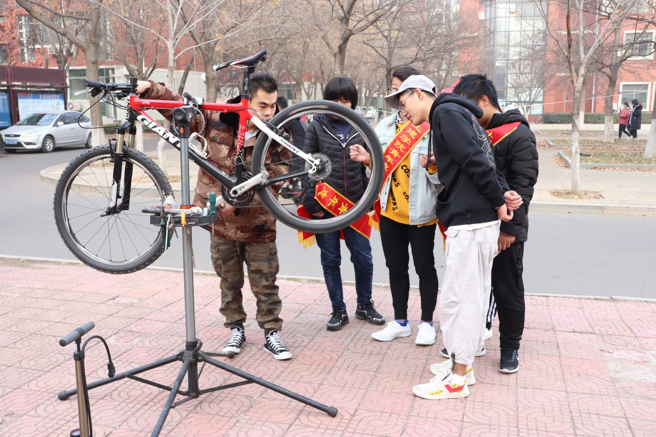 初冬的清晨还带着些许的寒意,志愿者们拿着维修自行车的工具,早早地来到繁星广场设立了维修点。为了提供更好的服务,他们特意请到了自行车维修店的专业技术人员来到维修点协助维修。上午9点,同学们陆陆续续地推着自行车前来寻求帮助,志愿者们结合自己平时所学,在专业技术人员的指导下认真研究自行车的问题所在及维修方法,无论是自行车链条、轴承的上油,还是自行车各种零件的修整、刹车器的调整,志愿者们都十分耐心细致,在调试完好并确认无误后交还给主人。冰凉的扳手,暖暖的情怀,志愿者们的爱心之举与辛勤劳动为同学们带去了极大的便利,更是温暖了整个校园。