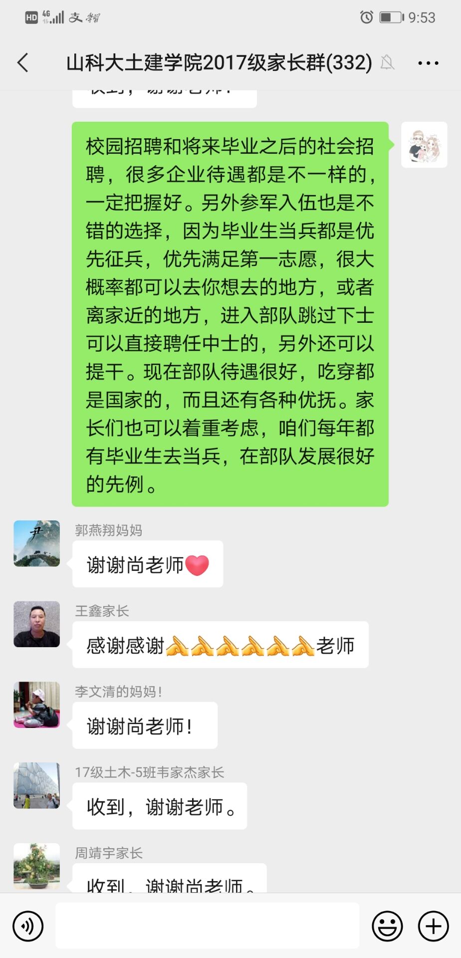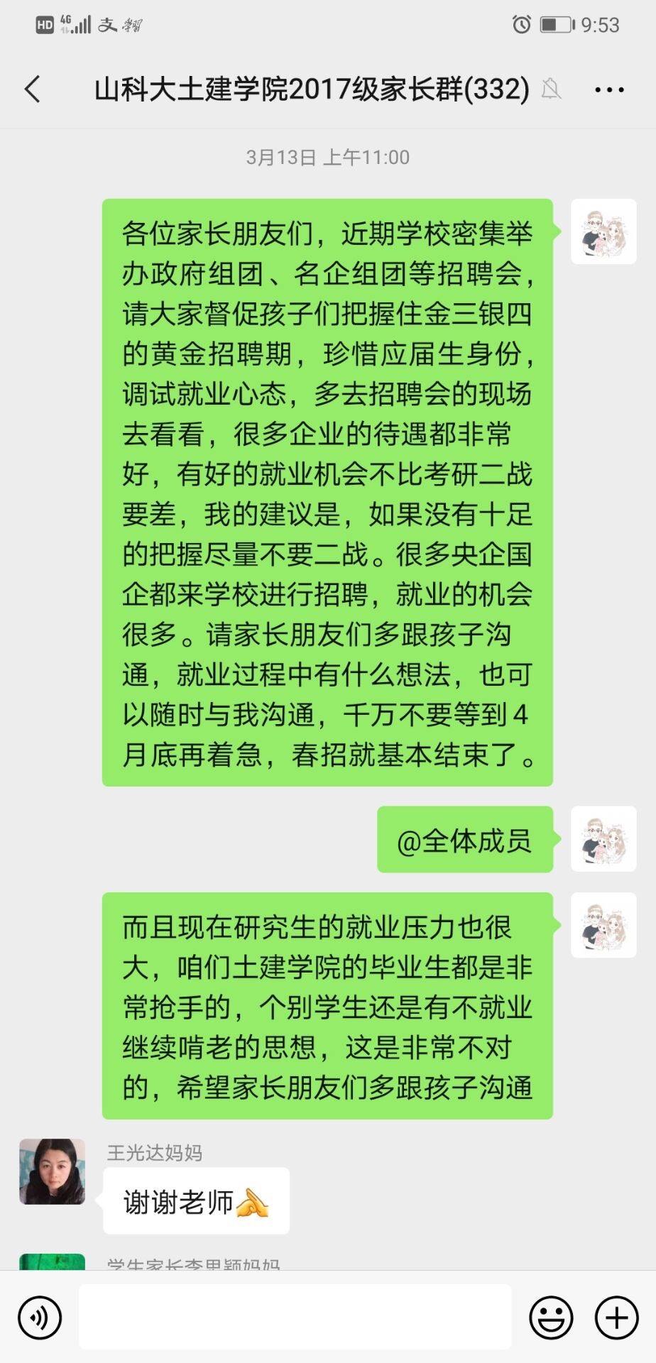推行“家校协同,合作育人,共促就业”为主题的员工就业指导工作。通过开展线上家长会及在毕业班家长群中发起话题的形式对员工就业情况、家长引导作用等话题进行共同探讨,并对当下员工“害怕就业”“不想就业”“不能就业”等状况针对性分析原因与表现并为家长提出建议,破除诸如“先就业再择业”的就业误解,鼓励员工在实践中提升自我能力与价值,放得下身段,避免“慢就业”。