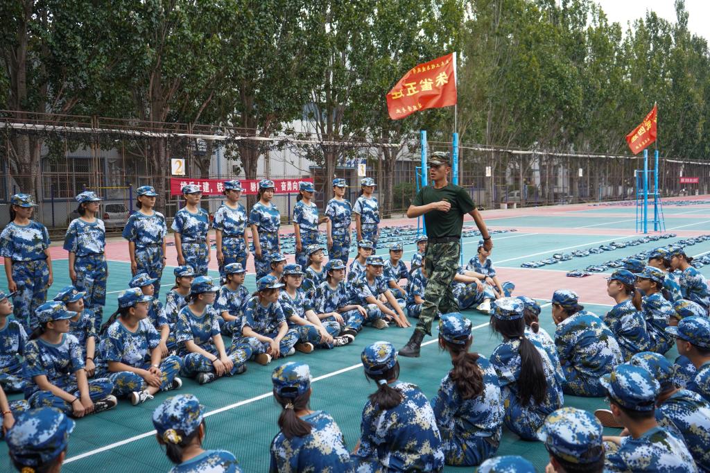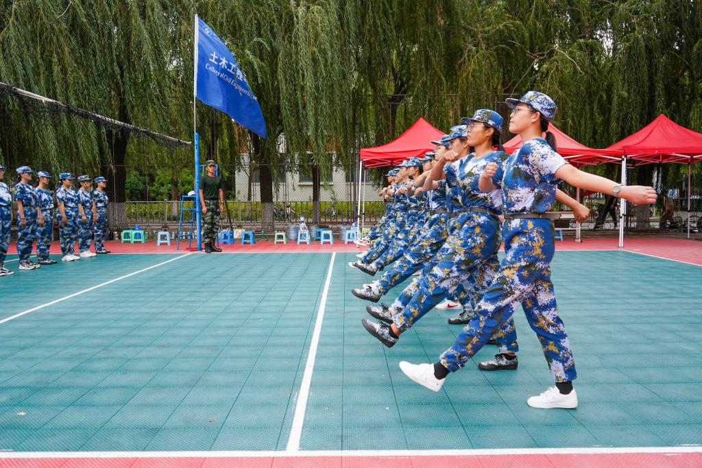 军训的天气依旧酷热难耐,阳光火辣辣地照射在排球场上,也无情地照射在同学们的身上。这样的高强度训练,没有摧垮同学们的意志,大家依旧拼尽全力地站立在自己的位置上,做着教官们指导的动作,喊出最响亮的口号。