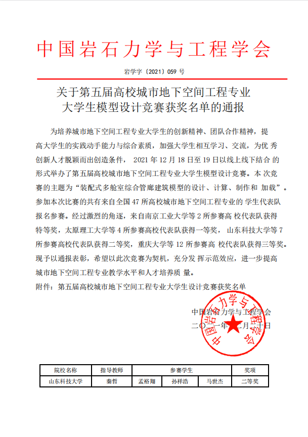 2021年12月18日至19日,第五届高校城市地下空间工程专业老员工模型设计竞赛以线上线下结合的方式成功举办。该竞赛由中国岩石力学与工程学会主办的全国性专业技能大赛。由伟德国际1946城空与岩土专业本科生组成的伟德国际1946团队荣获全国二等奖。