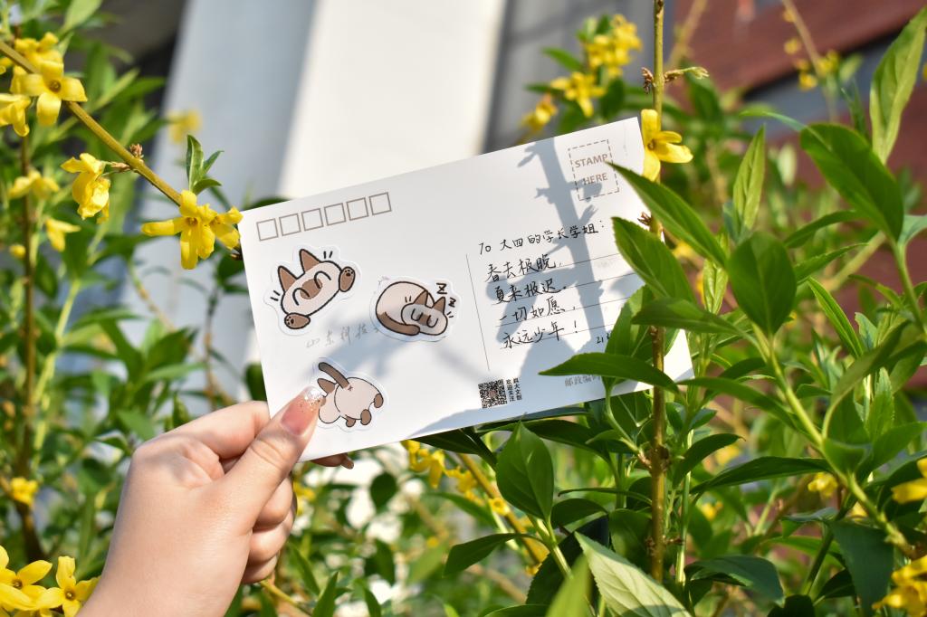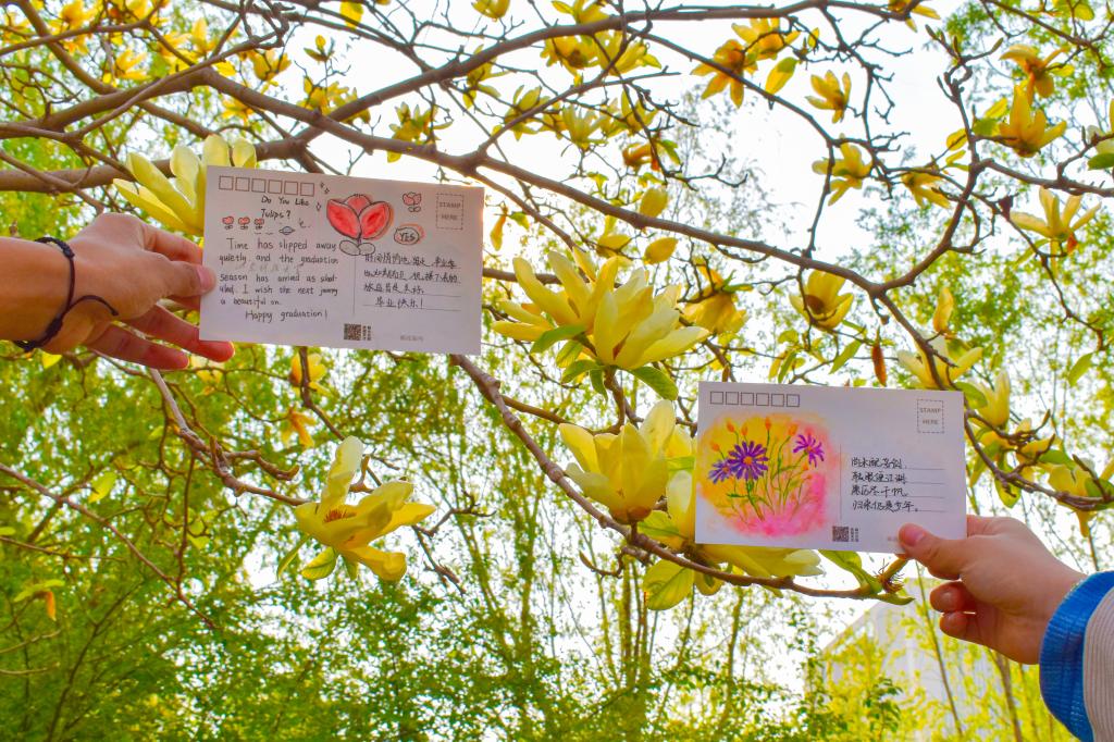活动中,参与的员工寄情于笔,或书写出自己对毕业生深深的祝福,或描绘出一幅幅色彩斑斓的画作,用自己的真情实意填满整张明信片。随后,同学们将充满依依惜别之意的明信片放置在校园美景中,将祝福遍布整个校园。同学们漫步于墨水河畔,行走于若水园中;于励志坊边走过,在晨读园中徘徊。“挥挥手,作别青春的校园,留下灿烂的笑容,祝你万事胜意”“愿前程似锦,祝未来可期”……这些真挚的祝福语无不承载着同学们的心意。明信片悬挂于万紫千红之间,与满园美景一起,为毕业生送出真挚的祝福。