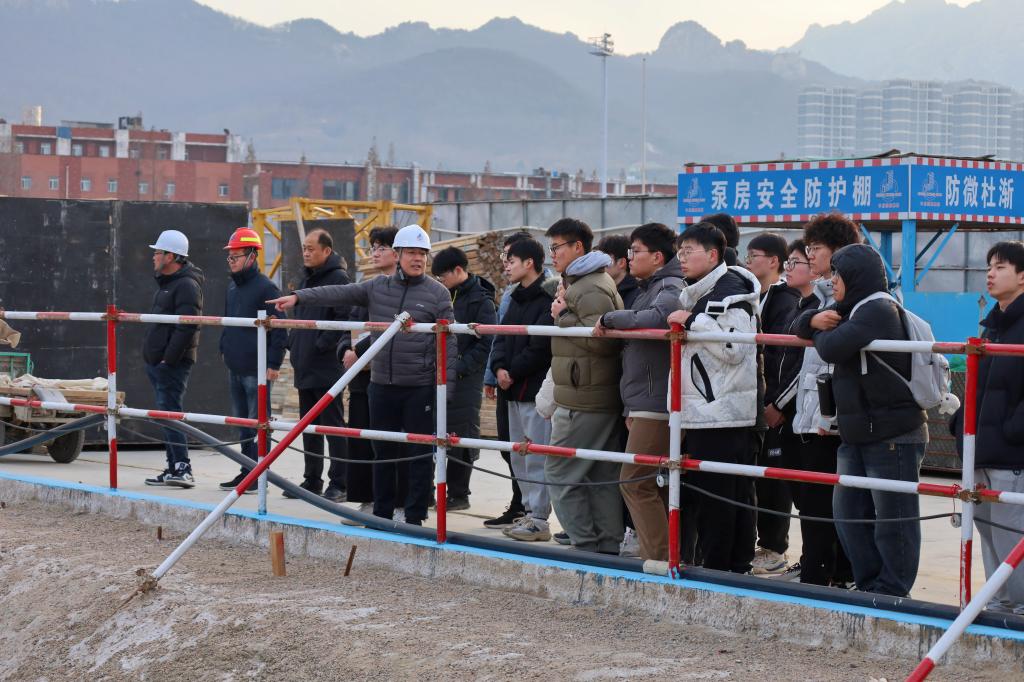 孙清典首先带领同学们来到公司供水供热泵房,详细介绍了公司站点分布、耗电、供暖及供水情况,并深入讲解了供水回水设备、水罐仪器设备及其供水原理,让同学们对校园基础能源供应设施有了直观的认识。随后,在韩庆防的带领下,同学们来到图书馆地下室,同学们参观了消防泵房、变配电室等设施,还了解到地下停车场雨棚、保温管道的材料使用细节,进一步拓宽了同学们的专业视野。最后,全体人员聚集在校东门建设施工现场,刘志强为同学们讲解了工地工程勘测、开挖、打桩、验收等施工顺序,强调了依据国家规范施工的重要性,使同学们对建筑施工流程有了清晰的认知。