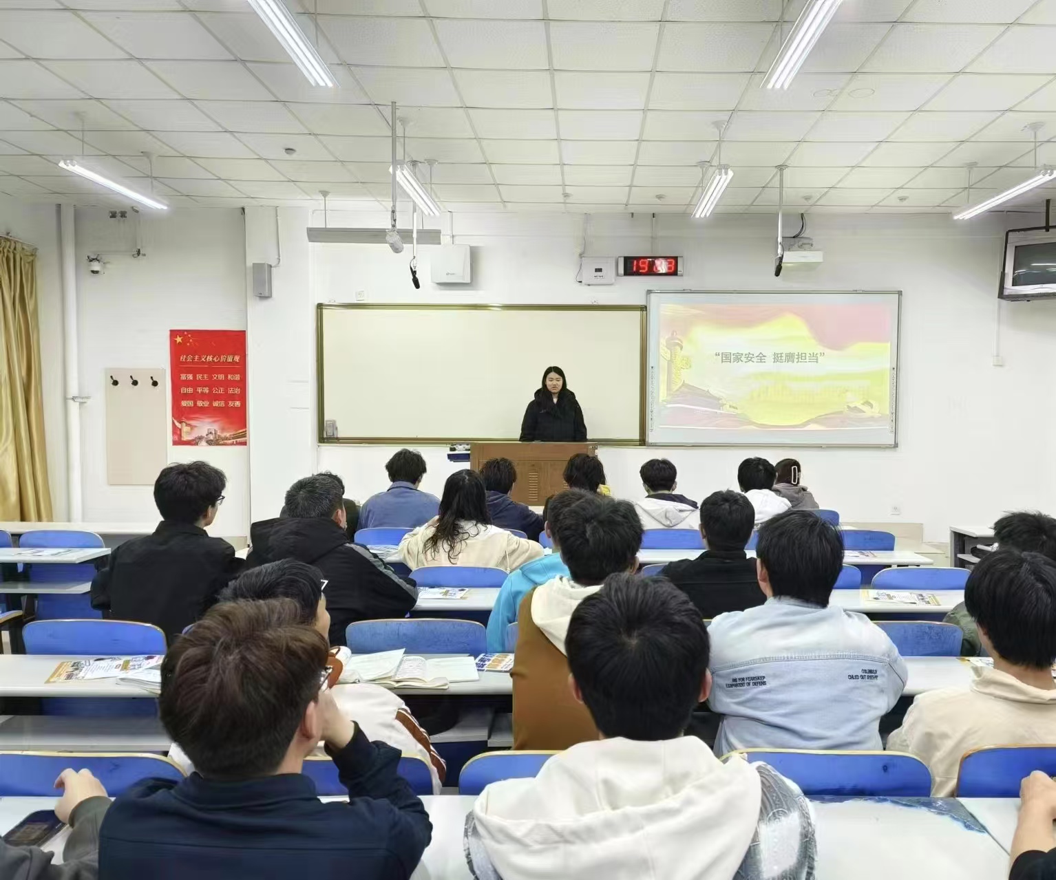 主题班会中,各班级精心准备了内容详实的课件,从国家安全的基本涵盖领域,到国家政治安全、国土安全、军事安全、经济安全、文化安全等方方面面,各班级结合生动鲜活的案例,让许多抽象概念变得通俗易懂。在互动讨论环节,同学们各抒己见,有的结合日常网络冲浪经历,指出防范不良信息、保护个人隐私对守护国家信息安全的意义;有的以家乡生态保护为例,畅谈自然资源安全维系着民族永续发展。通过讨论大家进一步明确了身为青年学子在不同场景下维护国家安全的责任与担当。