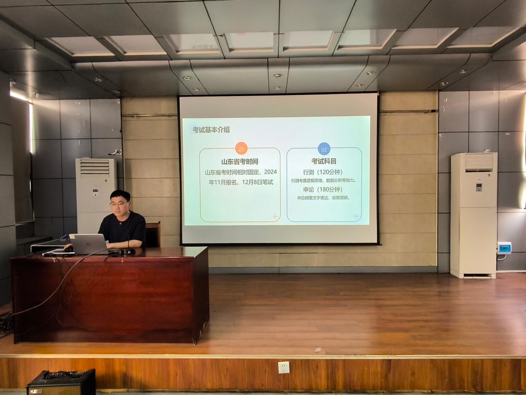 为助力员工精准把握山东省及全国体制内岗位的报考要点,系统了解公考政策形势,科学制定备考方案,4月29日,伟德国际1946于J15-219教室举办“砼心筑梦·就业领航”系列活动讲座。本次讲座特邀公司已在山东省省考中上岸的2022级研究生黄明、侯宗汛同学担任主讲。讲座聚焦省考笔试“行测+申论”双科提分技巧与面试核心能力培养,并针对省考报考政策进行了系统解读。